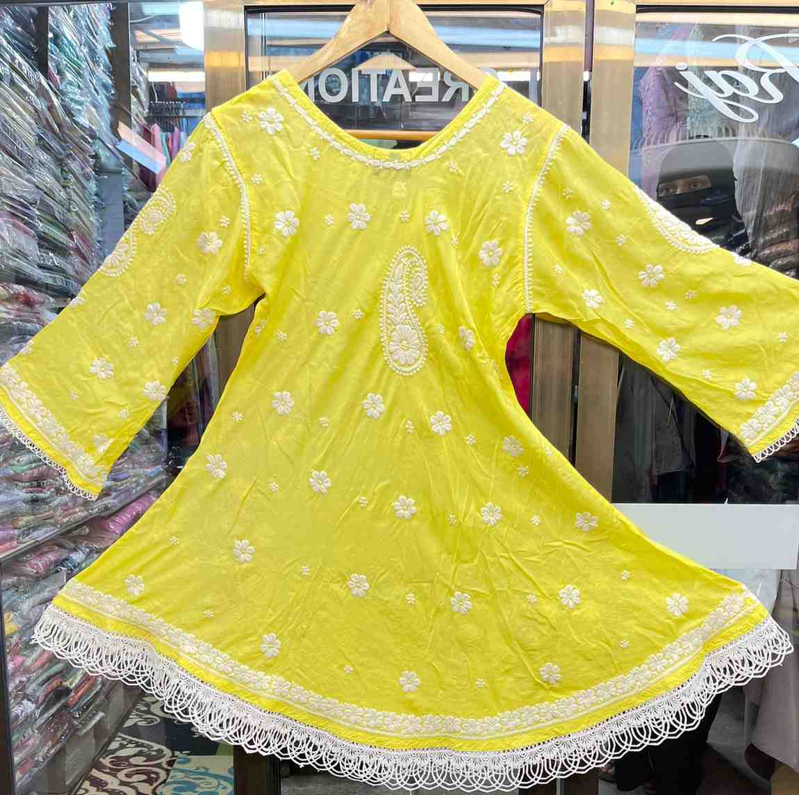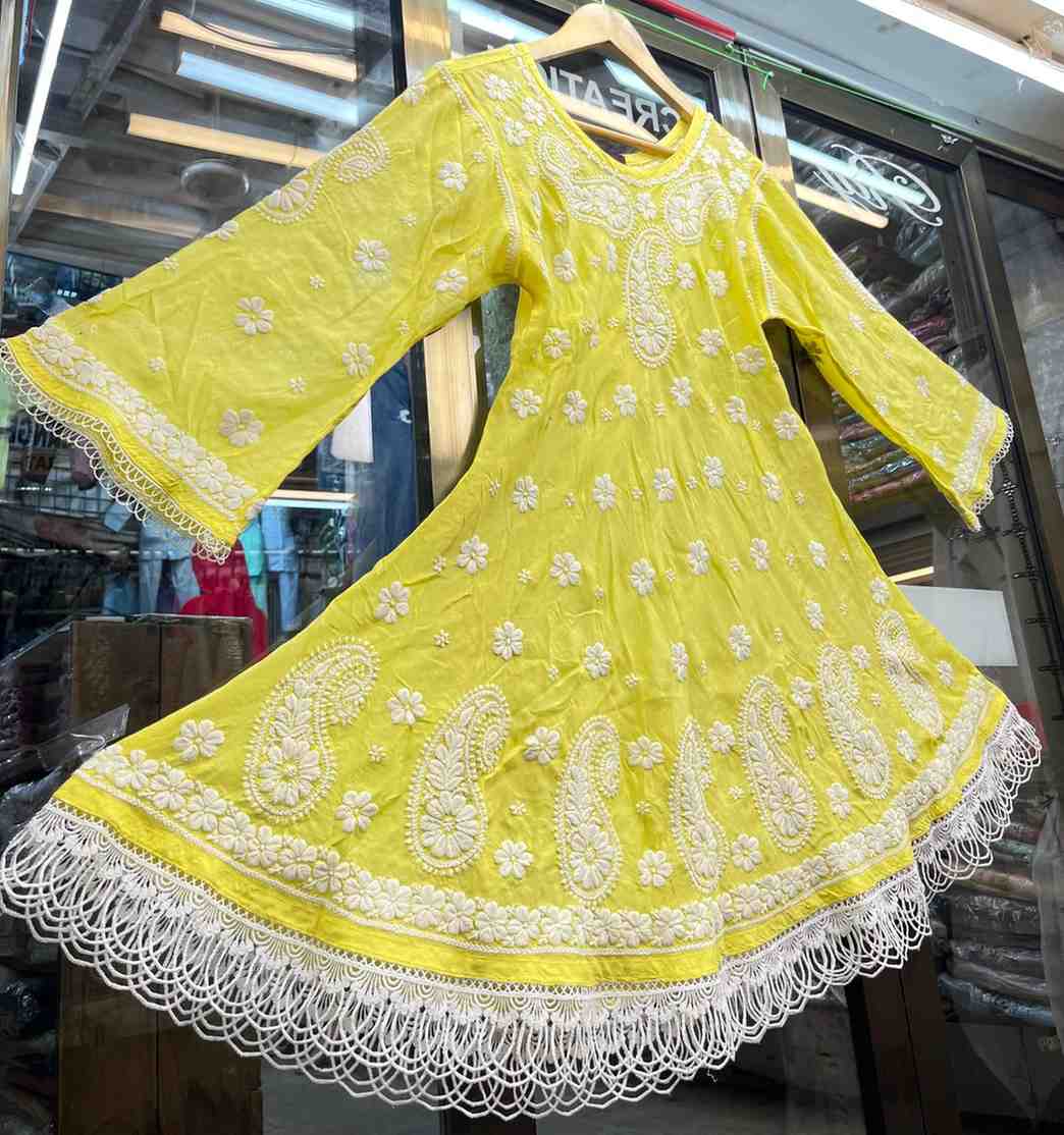 Radiate sunshine in this vibrant yellow embroidered kurti, beautifully designed with intricate white floral and paisley motifs. The flared silhouette with elegant lace detailing on the hem and sleeves adds a festive and cheerful charm, making it perfect for special occasions, celebrations, or pairing with your favorite ethnic bottoms for a dazzling look.
