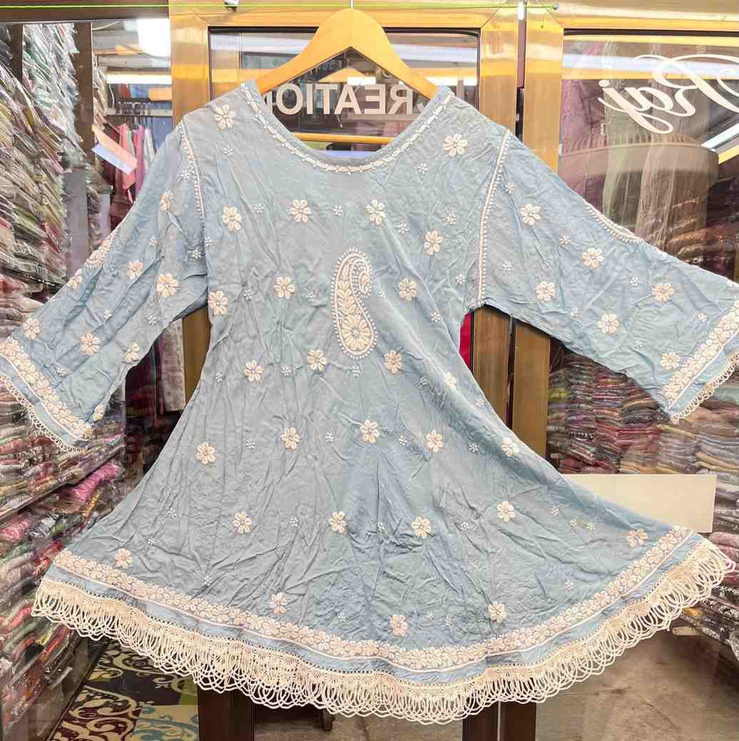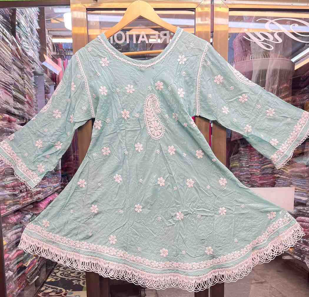 Refresh your wardrobe with this graceful mint green embroidered kurti, adorned with delicate white floral and paisley motifs. The flowy silhouette with lace detailing on the hem and sleeves adds a touch of elegance, making it perfect for festive gatherings, casual outings, or ethnic chic styling.