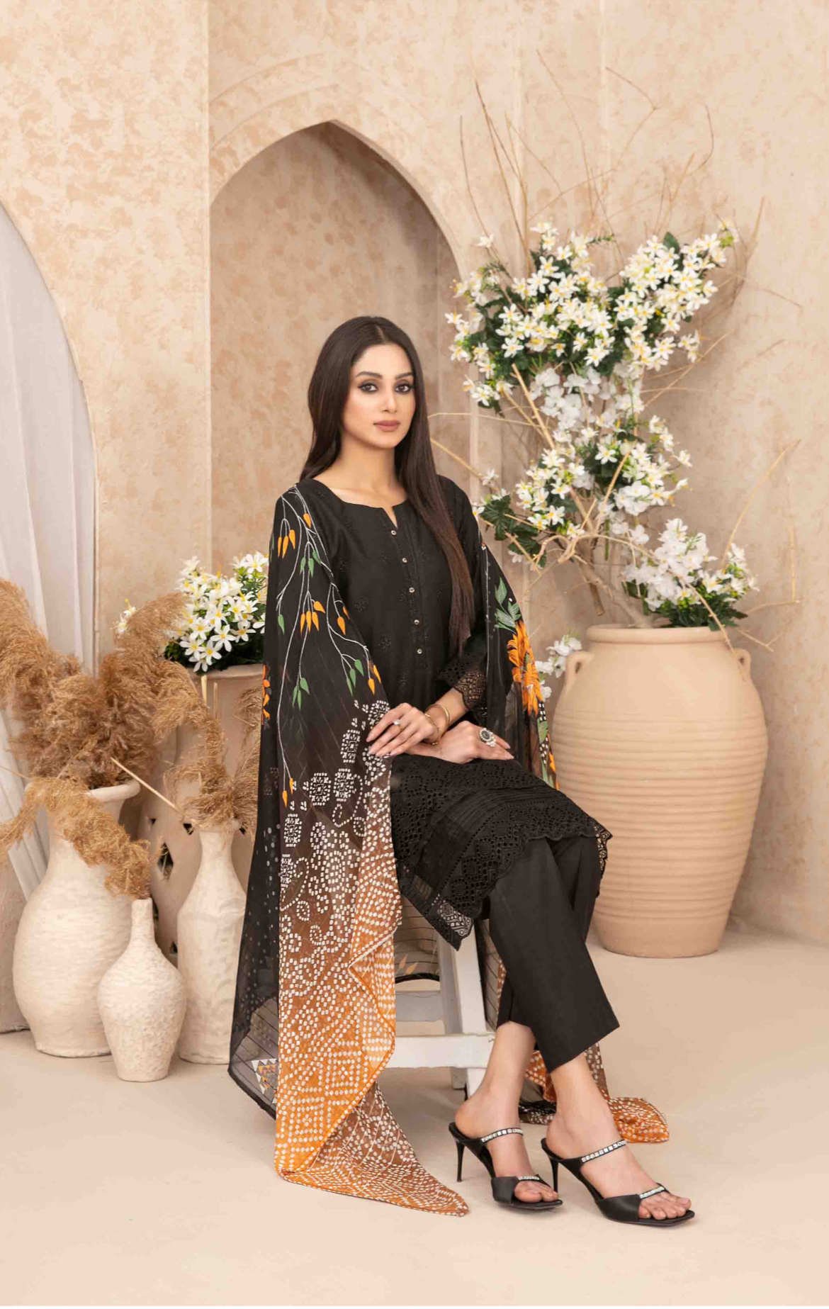 Black Suit with Printed Orange Dupatta |