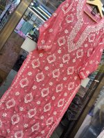 Bring vibrance to your ethnic wardrobe with this charming bright pink Chikankari kurti from LEEBAS. Handcrafted in pure cotton, this kurti is adorned with delicate white Chikankari embroidery, featuring traditional floral and paisley motifs for an eye-catching look.