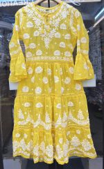 Add a touch of tradition and grace to your wardrobe with this stunning yellow Chikankari kurti. Crafted from breathable cotton, this kurti features intricate white floral embroidery throughout, offering a beautiful blend of ethnic charm and modern elegance. The flare sleeves and tiered design enhance its flowy silhouette, making it perfect for both casual outings and festive occasions.