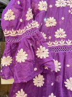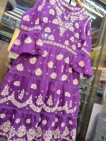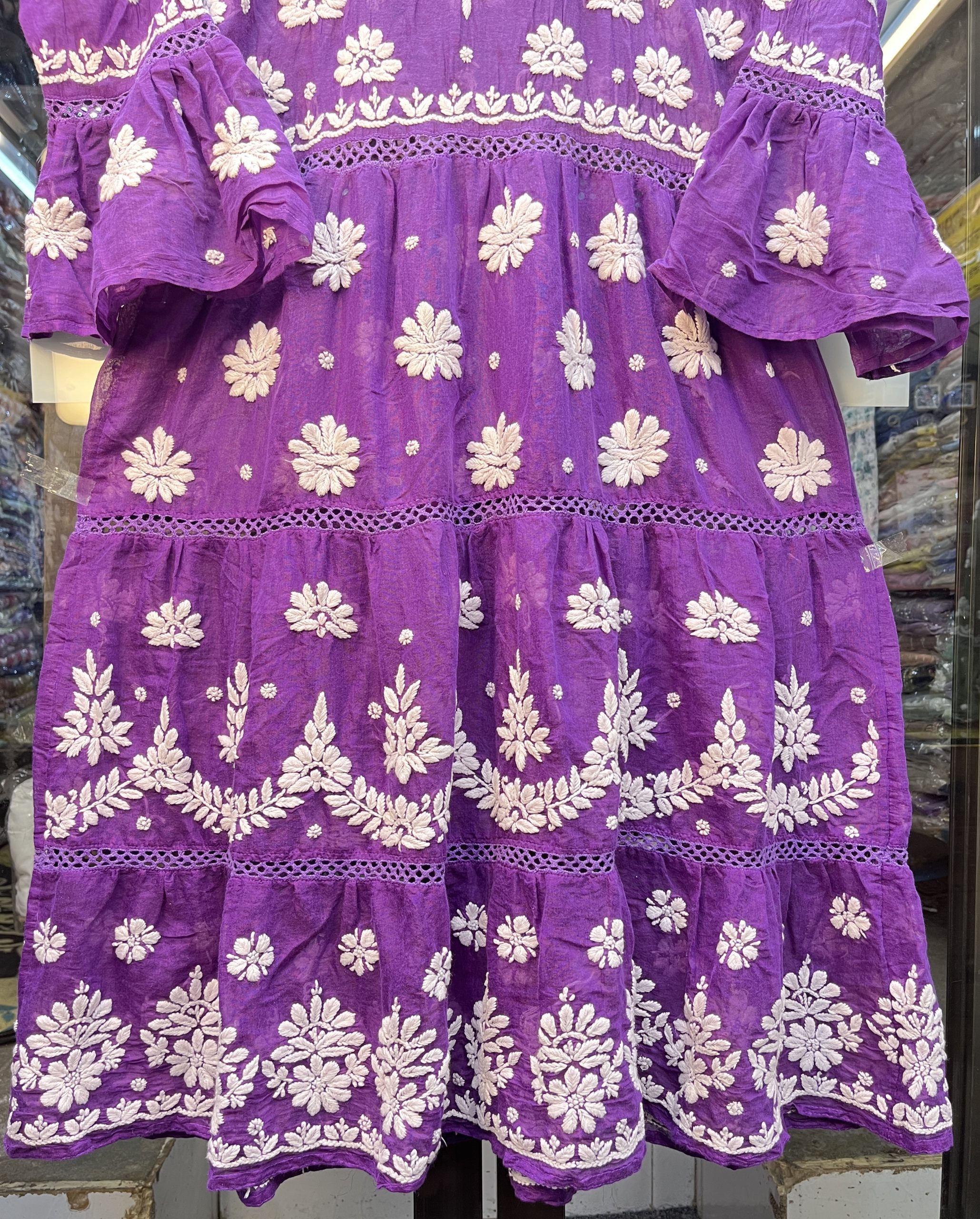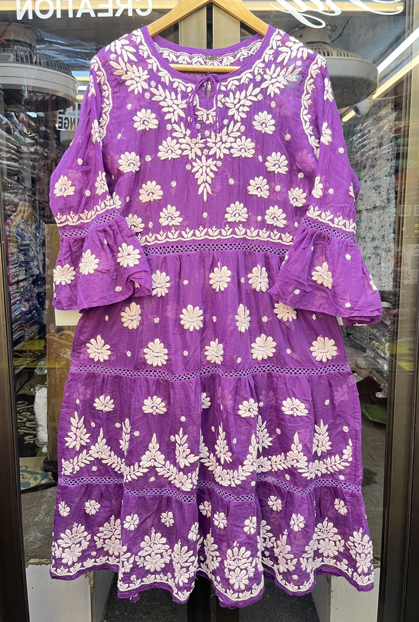 Add a touch of tradition and grace to your wardrobe with this stunning purple Chikankari kurti. Crafted from breathable cotton, this kurti features intricate white floral embroidery throughout, offering a beautiful blend of ethnic charm and modern elegance. The flare sleeves and tiered design enhance its flowy silhouette, making it perfect for both casual outings and festive occasions.