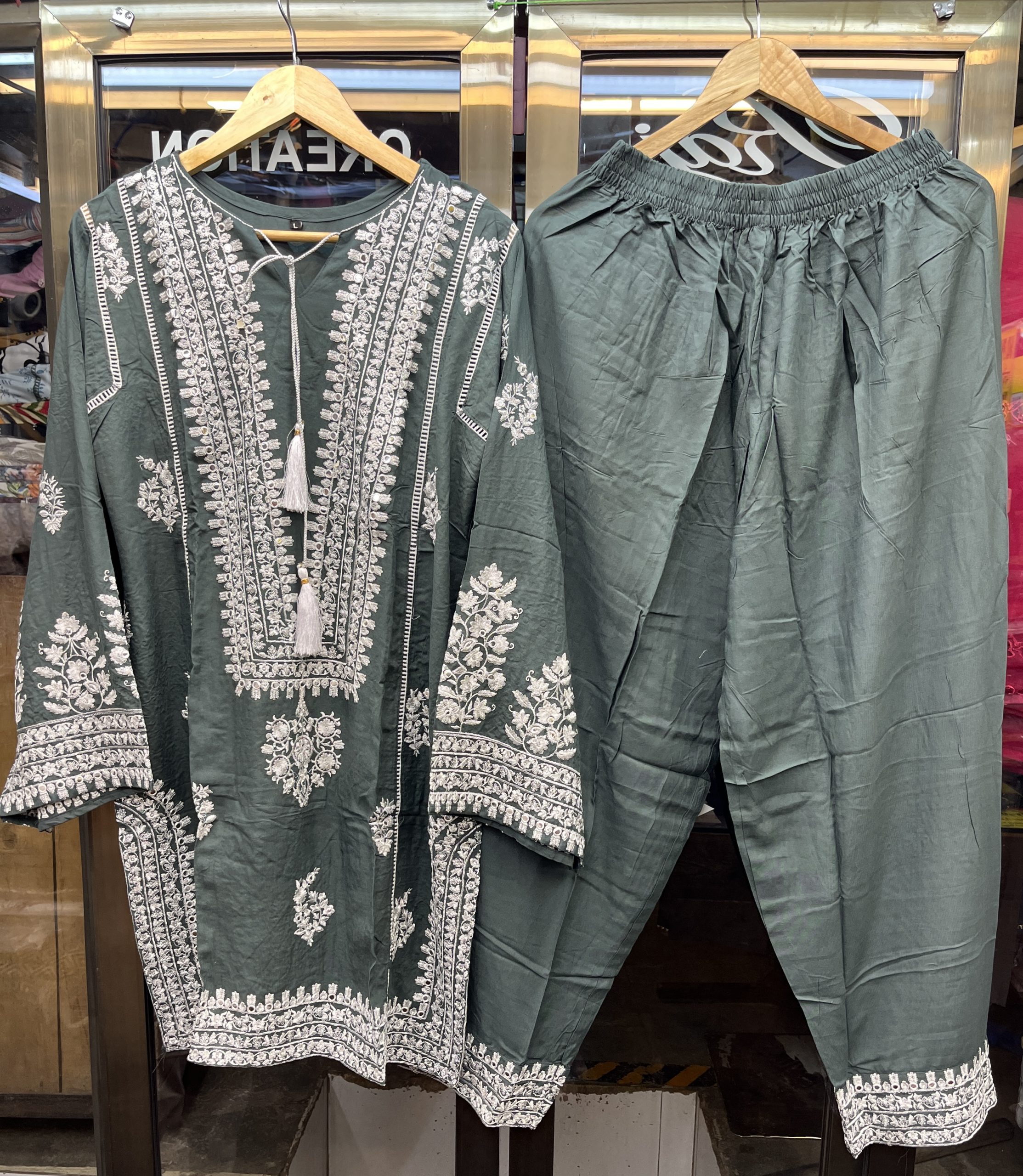 Step into elegance with this beautiful embroidered farshi cord set, featuring intricate white thread embroidery. The kurta boasts a traditional design with detailed embroidery on the neckline, sleeves, and borders, complemented by a matching pair of farshi bottoms with delicate embroidery on the hem. Perfect for festive occasions, casual gatherings, and ethnic celebrations.