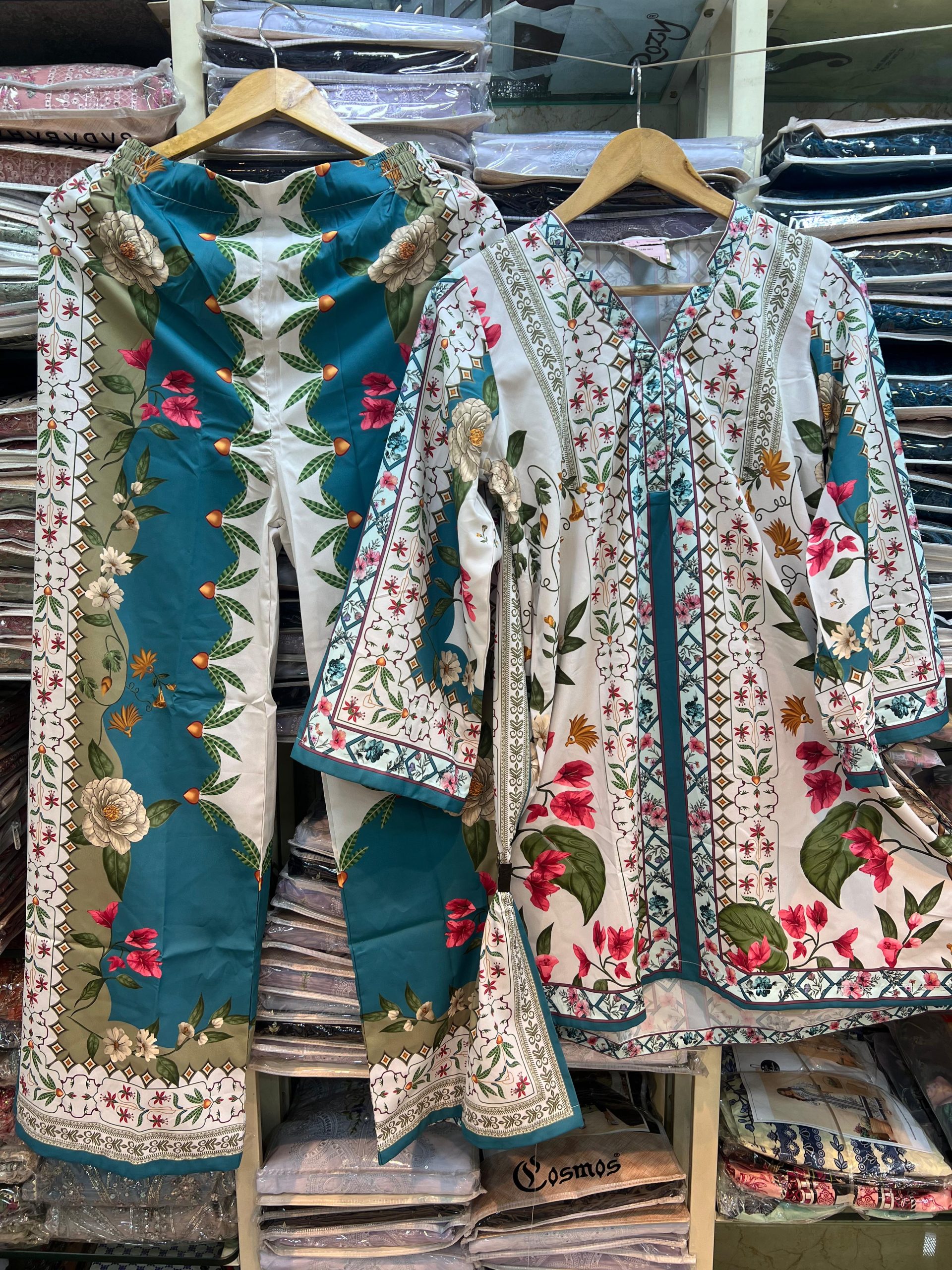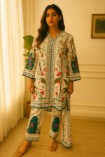 “Floral Printed White & Teal Co-ord Set for Women – Elegant Summer Wear |