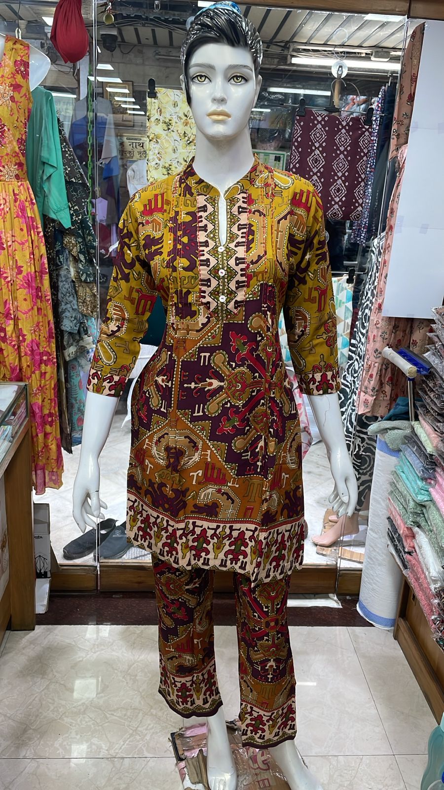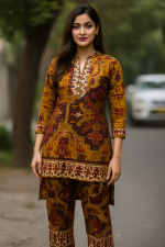 Brighten up your ethnic style with this mustard and maroon tribal print cotton kurta set. Featuring rich traditional designs, 3/4th sleeves, and a comfortable fit—ideal for everyday wear and small gatherings.