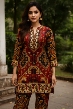 Step into bold ethnic fashion with this red and black tribal print cotton kurta set for women. Designed with rich colors, traditional motifs, and 3/4th sleeves—perfect for festive and casual looks.