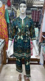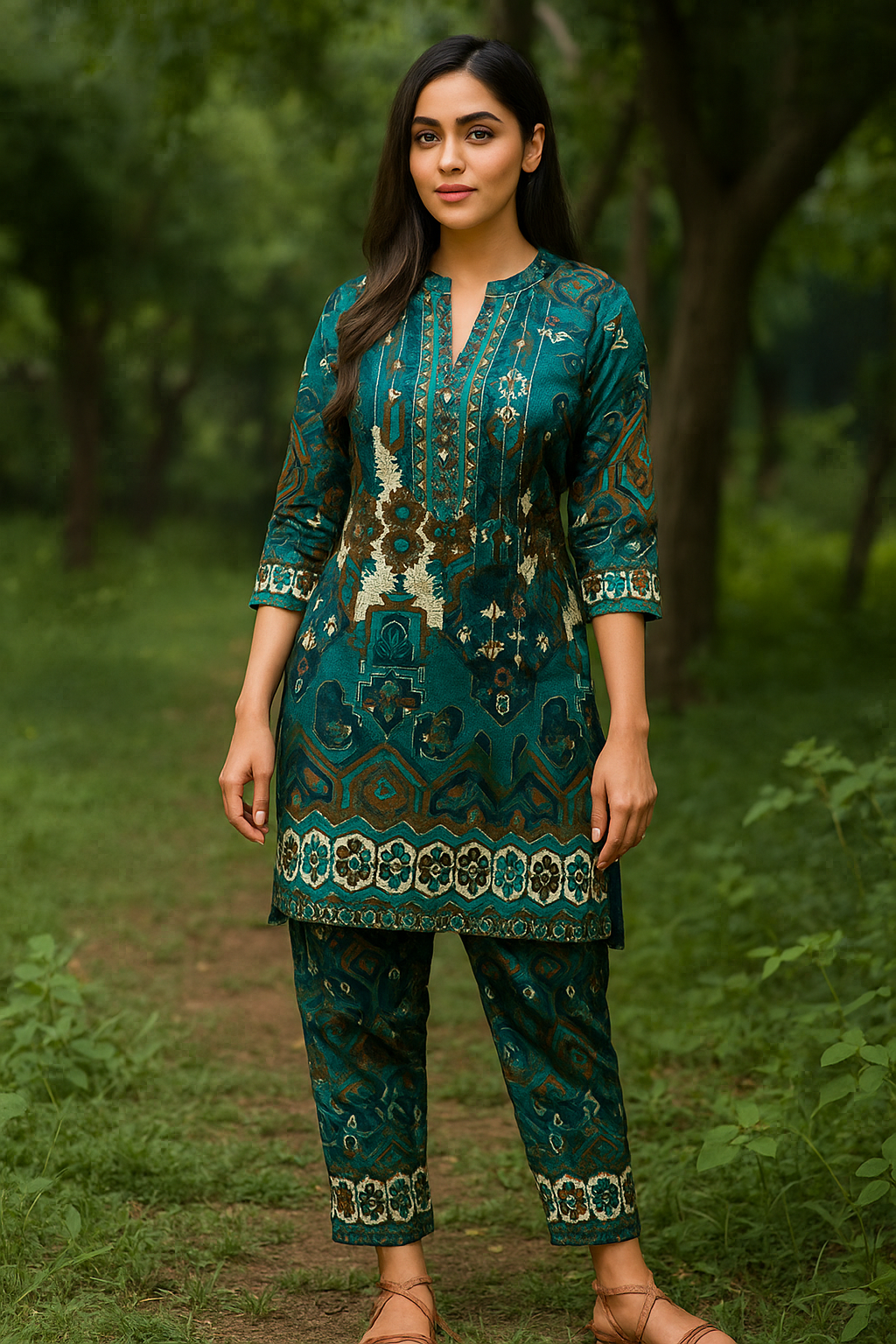 Showcase your ethnic charm with this teal green printed cotton cord suit. Intricate traditional patterns, comfortable fabric, and classic 3/4 sleeves make it a perfect choice for festive wear or everyday grace.