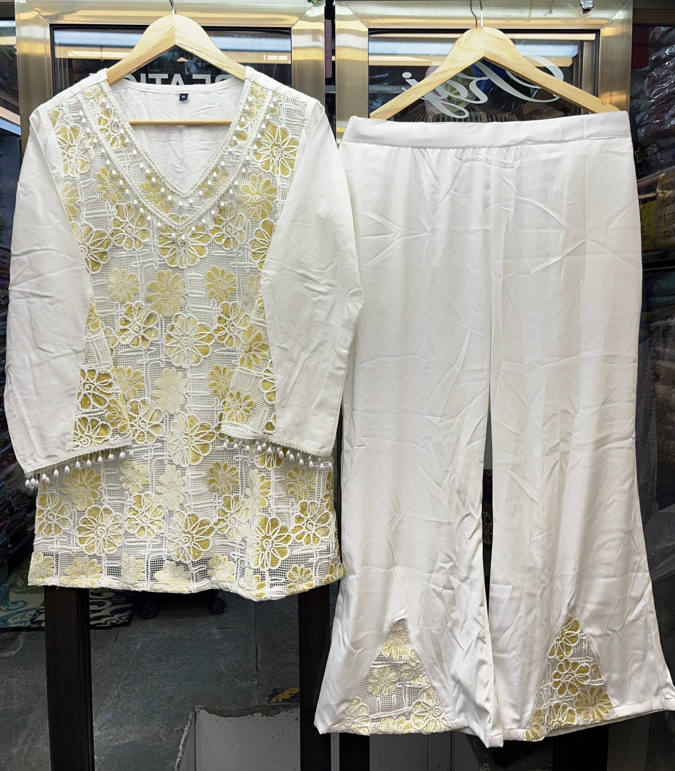 Elevate your style with this stunning cord set featuring a vibrant netted design. The kurta, designed with intricate patterns and a flattering neckline adorned with delicate buttons, is paired with wide-leg trousers that offer both comfort and elegance.