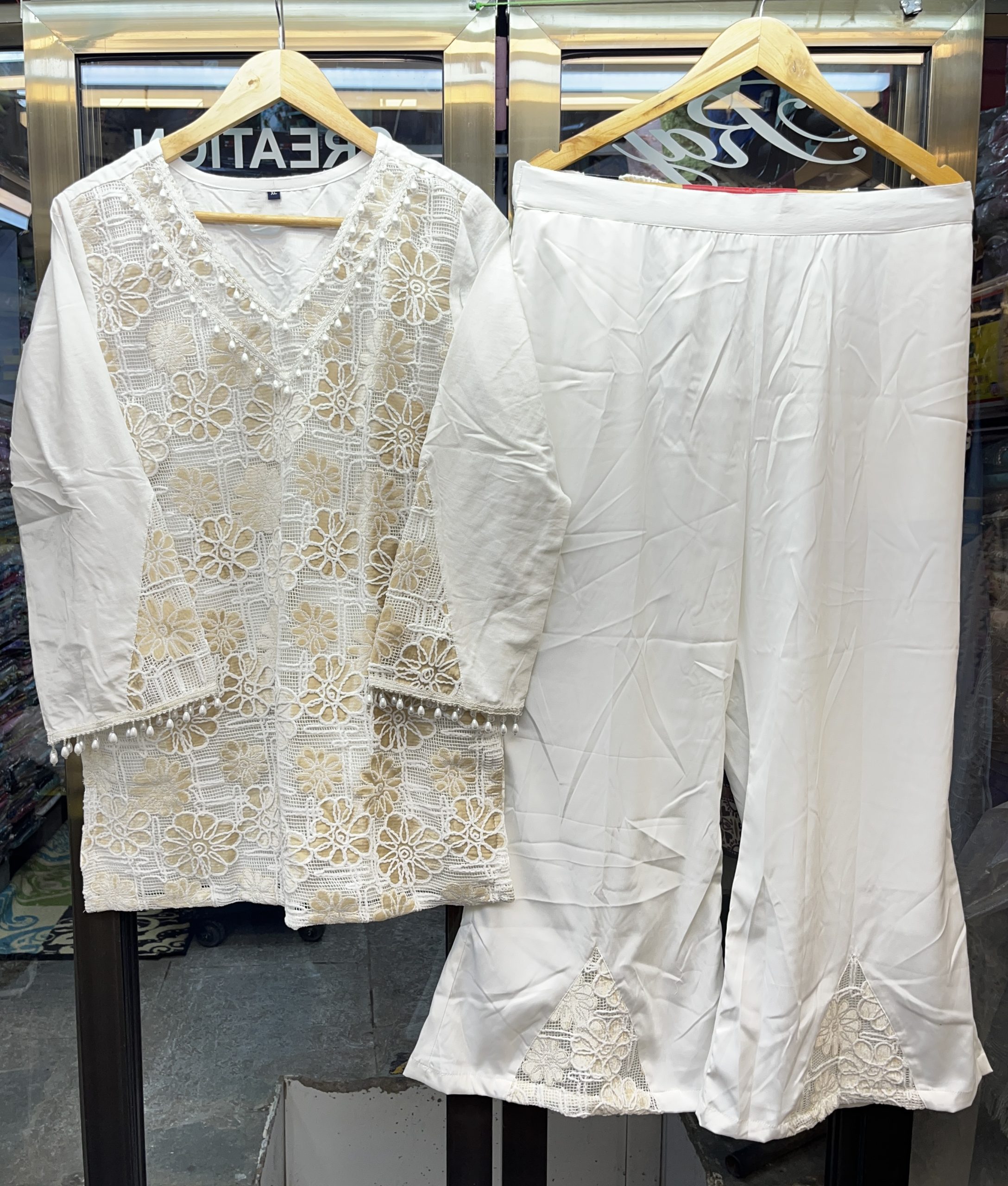 Elevate your style with this stunning cord set featuring a vibrant netted design. The kurta, designed with intricate patterns and a flattering neckline adorned with delicate buttons, is paired with wide-leg trousers that offer both comfort and elegance.