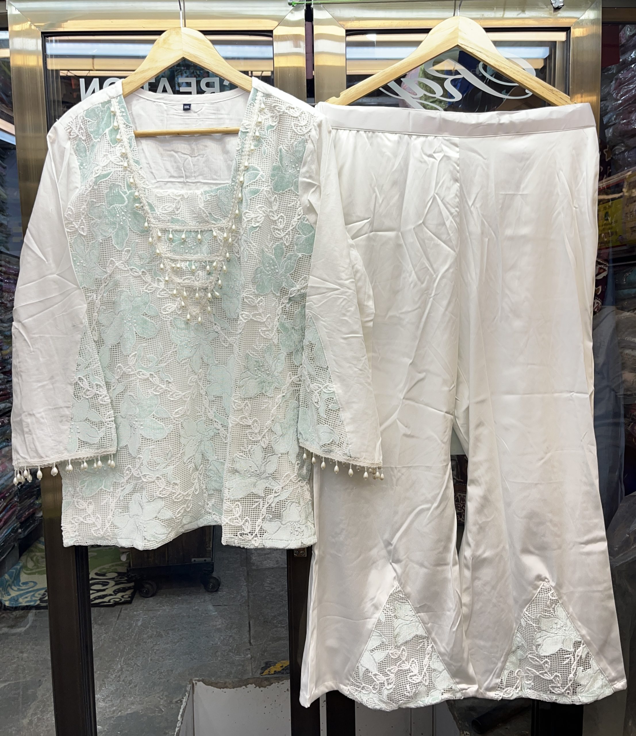 Elevate your style with this stunning cord set featuring a vibrant netted design. The kurta, designed with intricate patterns and a flattering neckline adorned with delicate buttons, is paired with wide-leg trousers that offer both comfort and elegance.