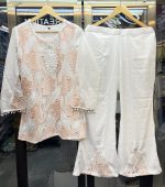 Elevate your style with this stunning cord set featuring a vibrant netted design. The kurta, designed with intricate patterns and a flattering neckline adorned with delicate buttons, is paired with wide-leg trousers that offer both comfort and elegance.