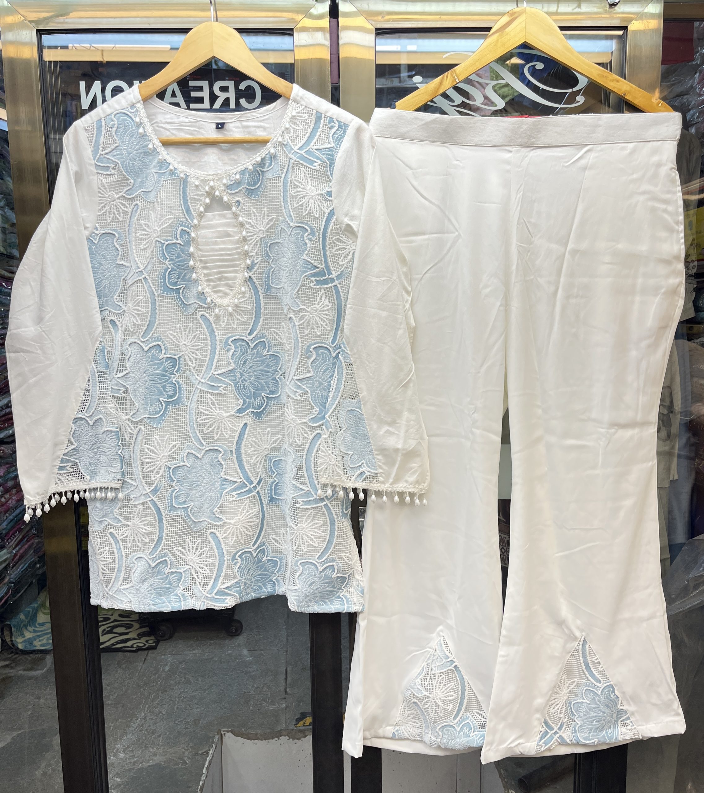 Elevate your style with this stunning cord set featuring a vibrant netted design. The kurta, designed with intricate patterns and a flattering neckline adorned with delicate buttons, is paired with wide-leg trousers that offer both comfort and elegance.