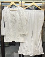 Elevate your style with this stunning cord set featuring a vibrant netted design. The kurta, designed with intricate patterns and a flattering neckline adorned with delicate buttons, is paired with wide-leg trousers that offer both comfort and elegance.